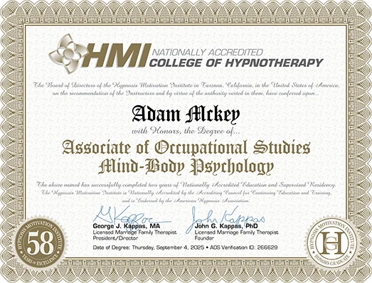 Adam McKey is a candidate for a Master of Arts in Counseling Psychology and a certified clinical hypnotherapist with advanced training in nervous system regulation, trauma-informed care, and subconscious patterning.
